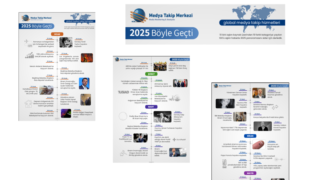 MTM Medya Takip Merkezi, medya ve sosyal medyayı kapsayan 10 bini aşkın kaynağın yıl boyunca taranmasıyla elde ettiği veriler ile 19 farklı kategoride 100’ü aşkın olayı kronolojik bir seçki hâline getirdi. Medya Takip Merkezi tarafından hazırlanan bu kapsamlı çalışma, öne çıkan tüm haberleri sade ve akıcı bir anlatımla sunarak 2025’e bütünlüklü bir bakış sağlıyor.