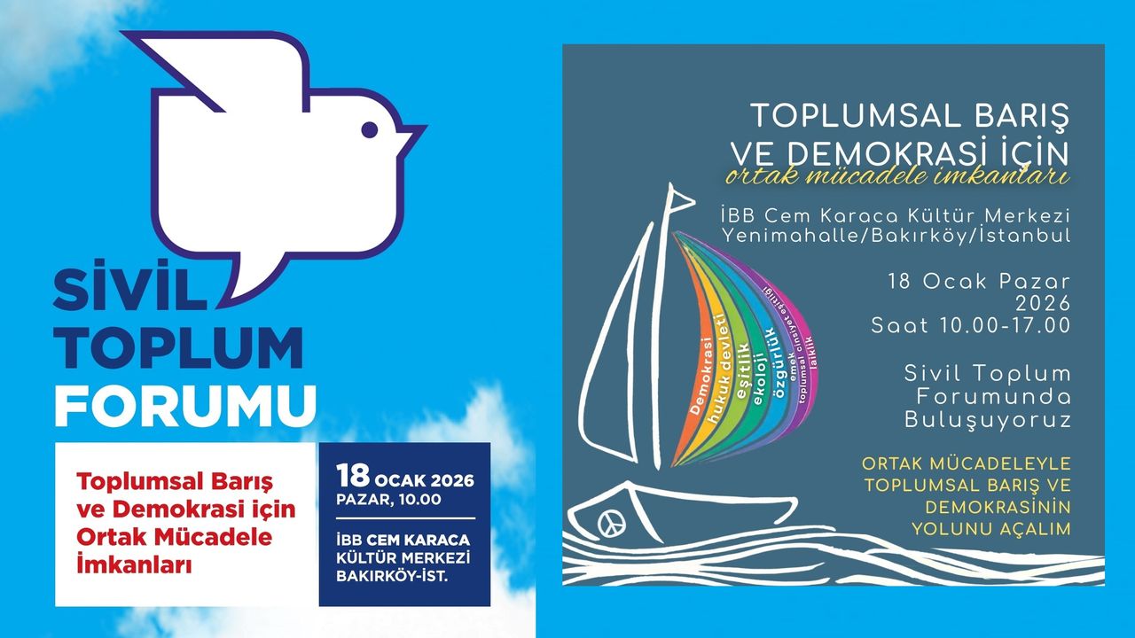 Aralarında insan hakları, emek, ekoloji, kadın, Alevi, engelli ve barış örgütlerinin de bulunduğu 34 sivil toplum örgütü, barış ve demokrasi sürecinin iktidarın inisiyatifine bırakılmaması gerektiğini vurgulayarak 18 Ocak 2026’da İstanbul Bakırköy’de sivil toplum forumu düzenleme çağrısı yaptı.