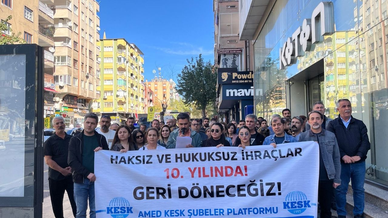 Kanun Hükmünde Kararnamelerle (KHK) ihraç edilen kamu emekçilerinin mücadelesi 10. yılına girdi. 29 Ekim 2016’da yayımlanan 675 sayılı KHK’nin üzerinden tam 10 yıl geçerken, KESK’e bağlı sendikalar Amed’de Ofis/AZC Plaza önünde “145. Hafta / 675 KHK – 10. Yıl” başlıklı basın açıklaması düzenledi. Açıklamayı Tüm Bel-Sen Amed Şube Eş Başkanı Mehmet Candar okudu.