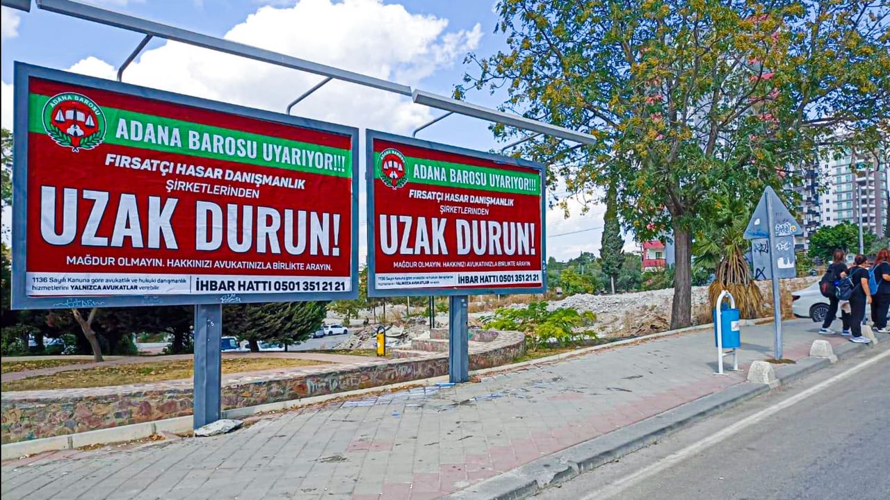 Adana Barosu, vatandaşları “fırsatçı hasar danışmanlık şirketleri”ne karşı uyardı. Şehrin farklı noktalarına yerleştirilen reklam panolarında “Adana Barosu Uyarıyor!!! Fırsatçı Hasar Danışmanlık Şirketlerinden Uzak Durun!” ifadeleri yer aldı.