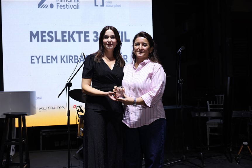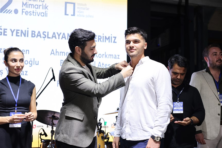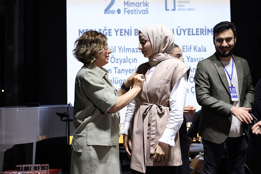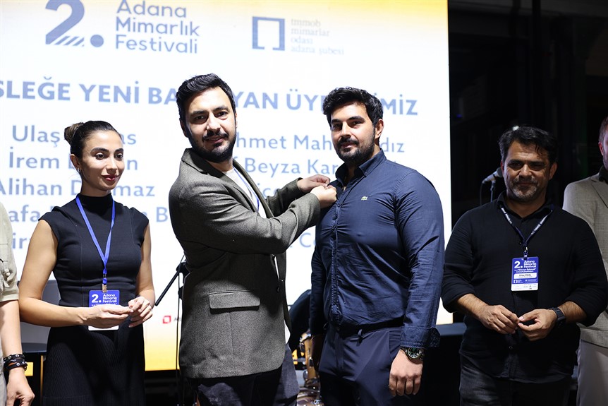 “Güneye Bakmak” temasıyla Adana’da gerçekleştirilen ve yoğun ilgi gören Mimarlık Festivali kapsamında mimarlar ve mimarlığa gönül vermiş yüzlerce insanı ağırlayan Mimarlar Odası Adana Şube Başkanı Canan Aksu ve Başkan Yardımcısı Serhat Çalık, Sekreter Üye Tuğba Ülgen, Sayman Üye Bora Işık, Yönetim Kurulu Üyeleri Ertaç Özel, Cansu Güneşer ve Öykü Baş, yeni öğrencilere rozet taktı, 30, 40 ve 50 yılını mimarlığa adayan tecrübeli mimarlara plaket sundu.