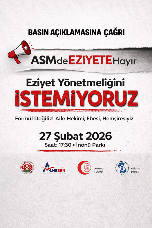 Adana’daki sağlık meslek örgütleri ve sendikalar, kamuoyunda “eziyet yönetmeliği” olarak adlandırılan Aile Hekimliği Sözleşme ve Ödeme Yönetmeliği’ne karşı tepkilerini sürdürüyor. Bu kapsamda Adana Tabip Odası, Genel Sağlık-İş Adana Şubesi, SES Adana Şubesi ve AHESEN ile birlikte Türk Tabipleri Birliği Merkez Konseyi’nin katılımıyla Adana’da 27 Şubat 2026 Cuma günü Saat:17.30'da İnönü Parkında basın açıklaması yapılacak.