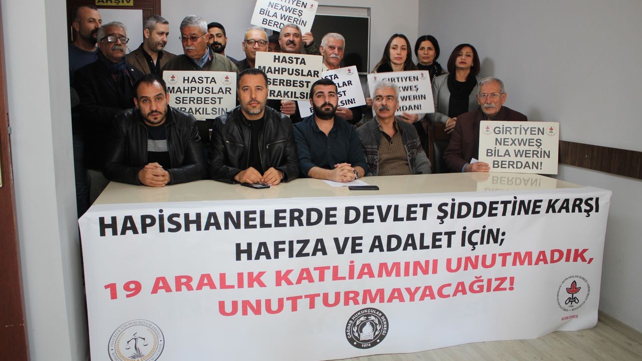 ÖHD, İHD ve ÇHD Adana temsilcilikleri, 19 Aralık 2000 Cezaevi Katliamı’nın 25. yılında İHD Adana Şubesi’nde basın açıklaması yaptı. Açıklamada cezasızlık politikalarına, ağır tecrit uygulamalarına ve hasta mahpusların durumuna dikkat çekildi.