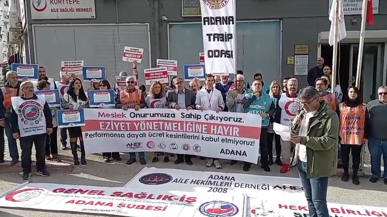Adana Tabip Odası, Sağlık ve Sosyal Hizmet Emekçileri Sendikası (SES) Adana Şubesi, Genel Sağlık-İş Sendikası Adana Şubesi, Hekim Birliği Sendikası ve Aile Hekimleri Dernekleri Federasyonu (AHEF) tarafından “Eziyet Yönetmeliğine Hayır” başlığıyla basın açıklaması gerçekleştirildi. Açıklama, Kurttepe Aile Sağlığı Merkezi (ASM) önünde yapıldı.