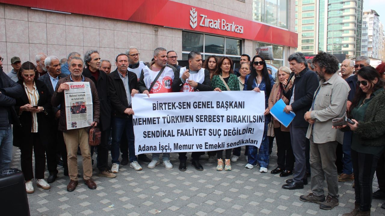 Adana’da BİRTEK-SEN Genel Başkanı Mehmet Türkmen’in tutukluluğuna karşı düzenlenen basın açıklamasında konuşan Av. Tugay Bek, sürecin hukuki değil, emek mücadelesini hedef alan bir nitelik taşıdığını söyledi.
