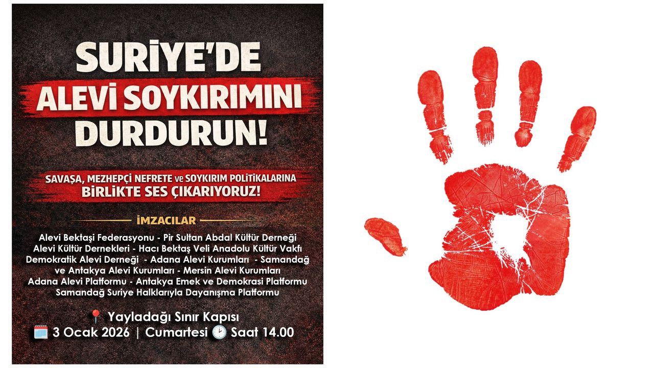 Alevi kurumları ve emek-demokrasi platformları, Suriye’de Alevi halkına yönelik sürdürülen saldırılara ve yok etme politikalarına karşı 3 Ocak 2026’da Yayladağı Sınır Kapısı’nda kitlesel bir buluşma çağrısı yaptı. “Sessizlik suça ortaklıktır” vurgusuyla yapılan çağrıda, savaş ve mezhepçi nefrete karşı dayanışma yükseltilmeye çağrıldı.