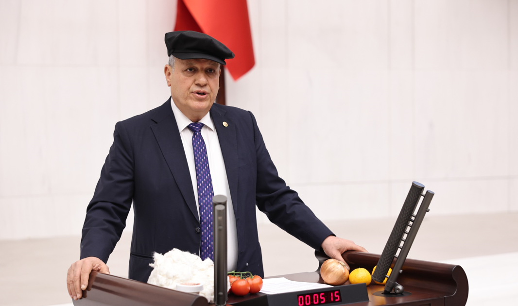 "Buraya manav açmaya gelmedik. Bu yıl çiftçi ne ektiyse zarar etti. Örneğin, şu pamuk: Kilosu 30 liraya mal oldu, 40 liraya satılması gerekirken 25 liraya satıldı. Yine, şu soğan: 8-10 liraya mal oldu, 4 liraya satıldı, sonradan da tarlada çürüdü. Domates, aynı şekilde çürüdü. Şu erkenci mandalinanın 8 lira, 10 lira olması gerekirken 1 liraya, 2 liraya şu anda da alıcısı yok. Değerli arkadaşlar, aynısı karpuz için, patates için de geçerli. Bu gördüğünüz şapka var ya, bu gördüğünüz şapka çiftçimizin sembolüdür, simgesidir. Çiftçi, kazanç sağladığı zaman bu şapkayı her zaman havaya fırlattı ama AKP iktidarında üretici hiçbir zaman bu şapkayı havaya atamadı, âdeta hep böyle yere fırlattı."