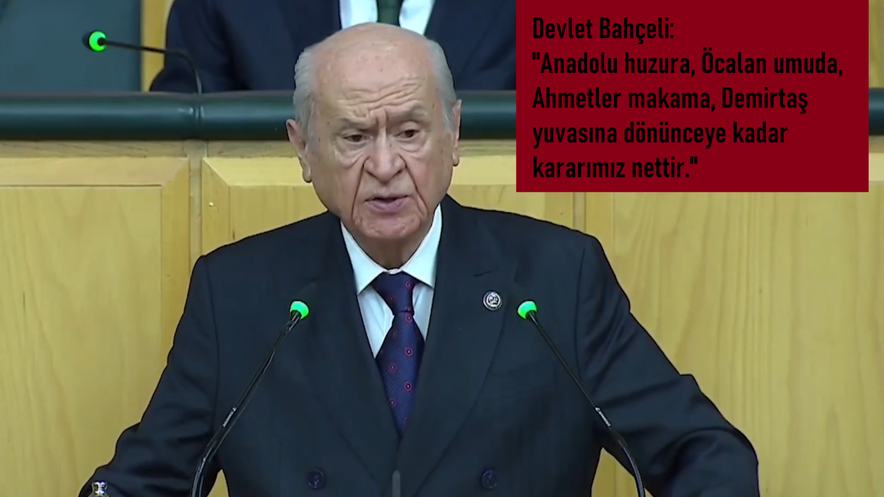 Bahçeli, konuşmasında Türkiye’deki sürece ve CHP Genel Başkanı Özgür Özel’in “erken seçim” çağrılarına ilişkin açıklamalara yer verirken, grup toplantısını şu sözlerle tamamladı: "Anadolu huzura, Öcalan umuda, Ahmetler makama, Demirtaş yuvasına dönünceye kadar kararımız nettir." Bahçeli'nin konuşmasında öne çıkanlar şöyle: