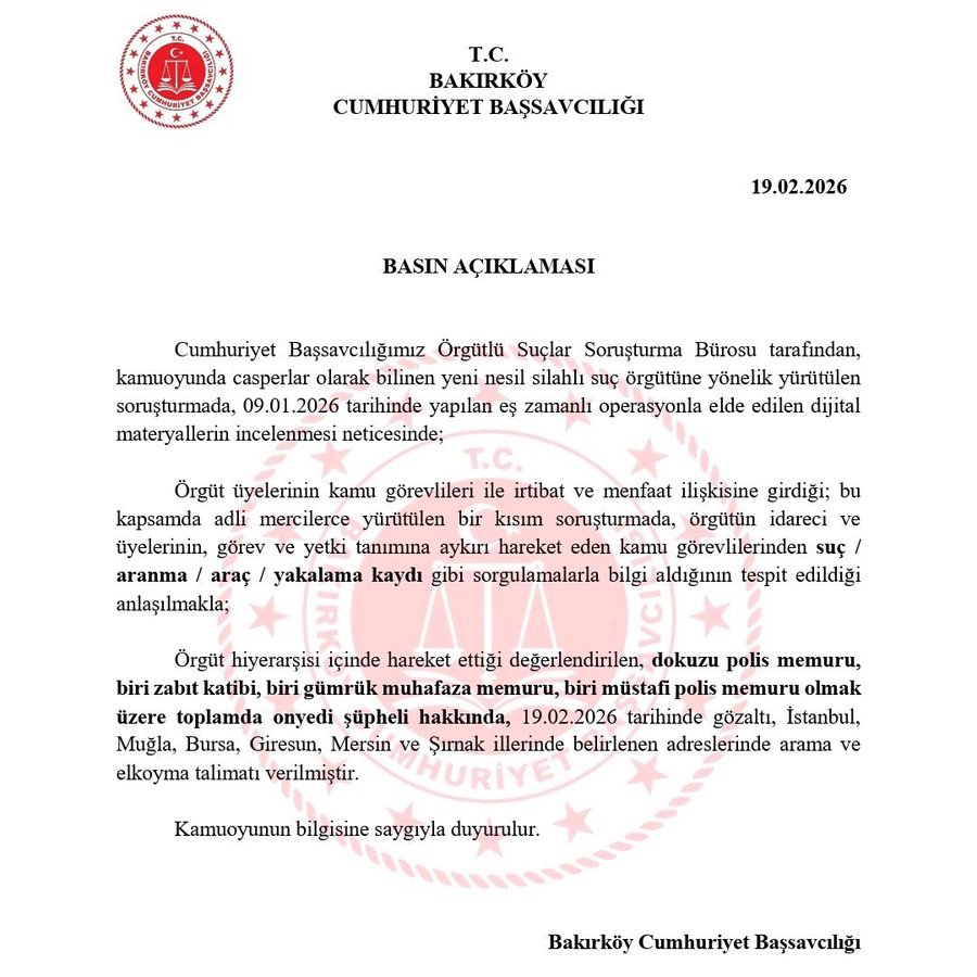 Bakırköy Cumhuriyet Başsavcılığı tarafından yapılan açıklamada, kamuoyunda “Casperlar” olarak bilinen yeni nesil silahlı suç örgütüne yönelik yürütülen soruşturma kapsamında önemli bulgulara ulaşıldığı belirtildi.