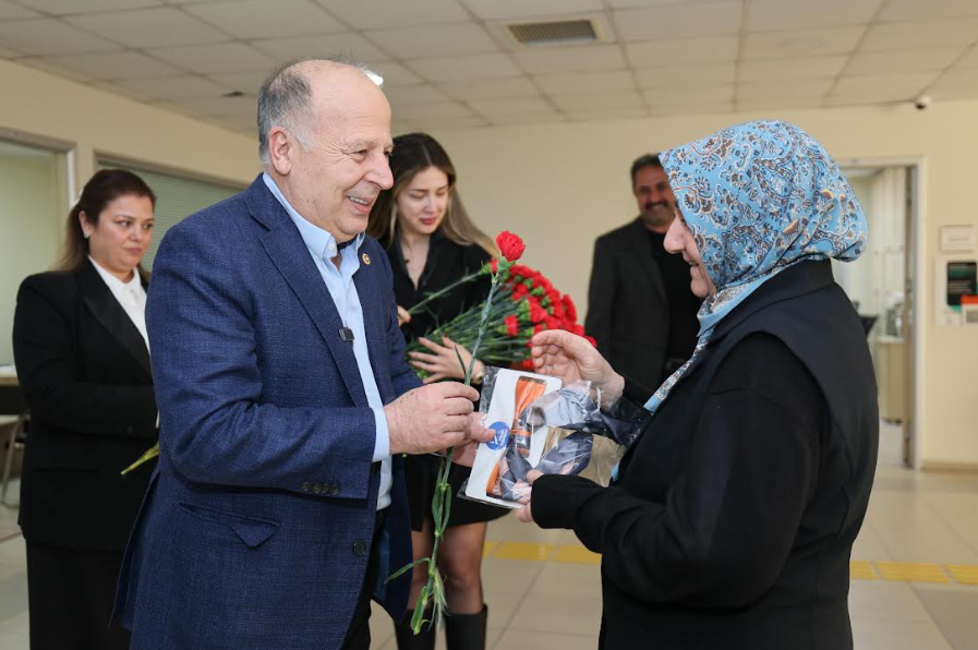 Belediye birimlerini tek tek ziyaret eden Başkan Demirçalı, özverili çalışmalarıyla Yüreğir’e değer katan kadın personele karanfil takdim etti.