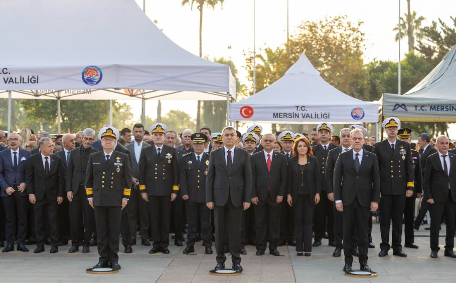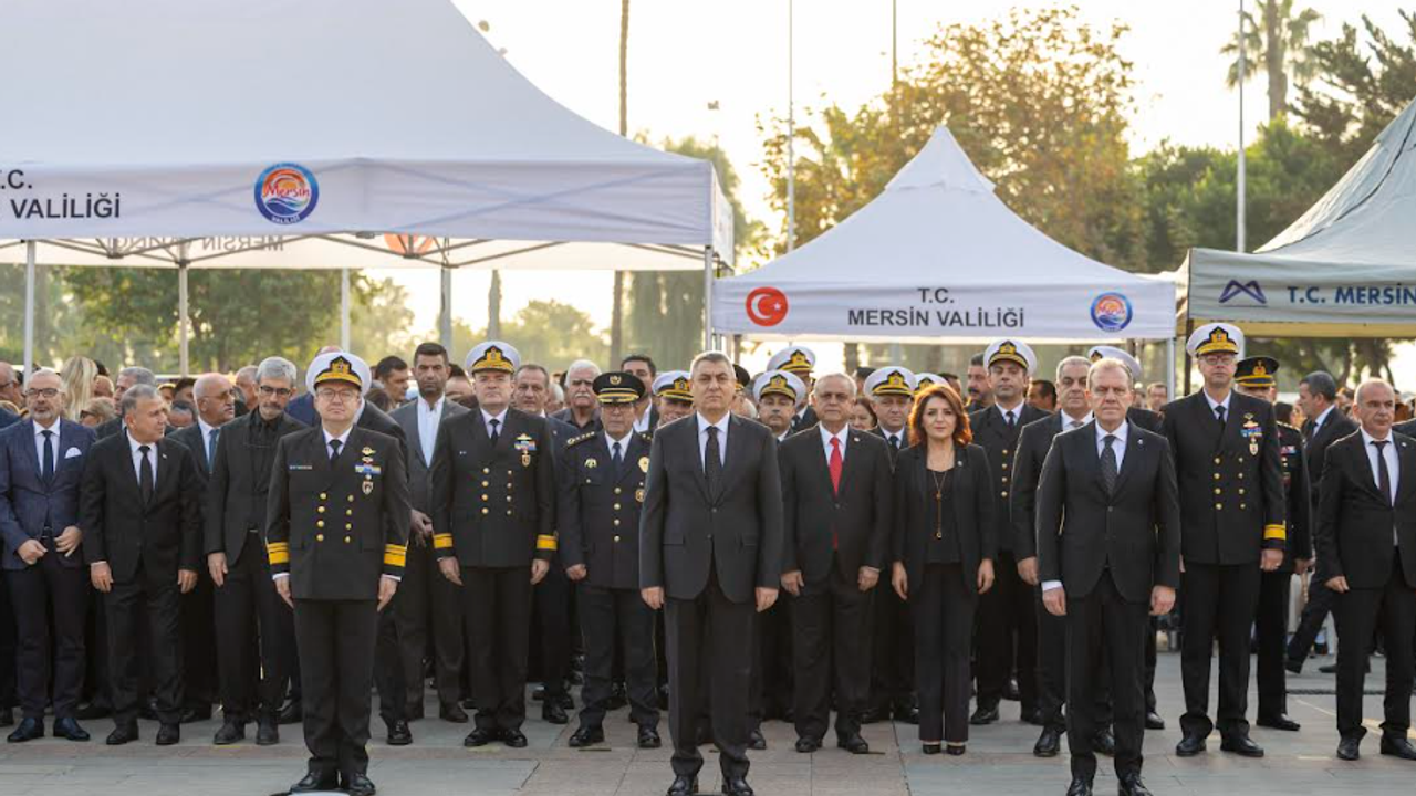Cumhuriyet Meydanı’nda gerçekleştirilen tören, Mersin Valiliği, Akdeniz Bölge ve Garnizon Komutanlığı ve Mersin Büyükşehir Belediyesi ile kent protokolü tarafından Atatürk Anıtı’na çelenk sunulmasıyla başladı. Saat 09.05’te siren sesleri eşliğinde saygı duruşunda bulunuldu. Saygı duruşunun ardından Akdeniz Bölge ve Garnizon Komutanlığı Bandosu eşliğinde İstiklal Marşı’nın okunmasıyla resmi tören sona erdi.