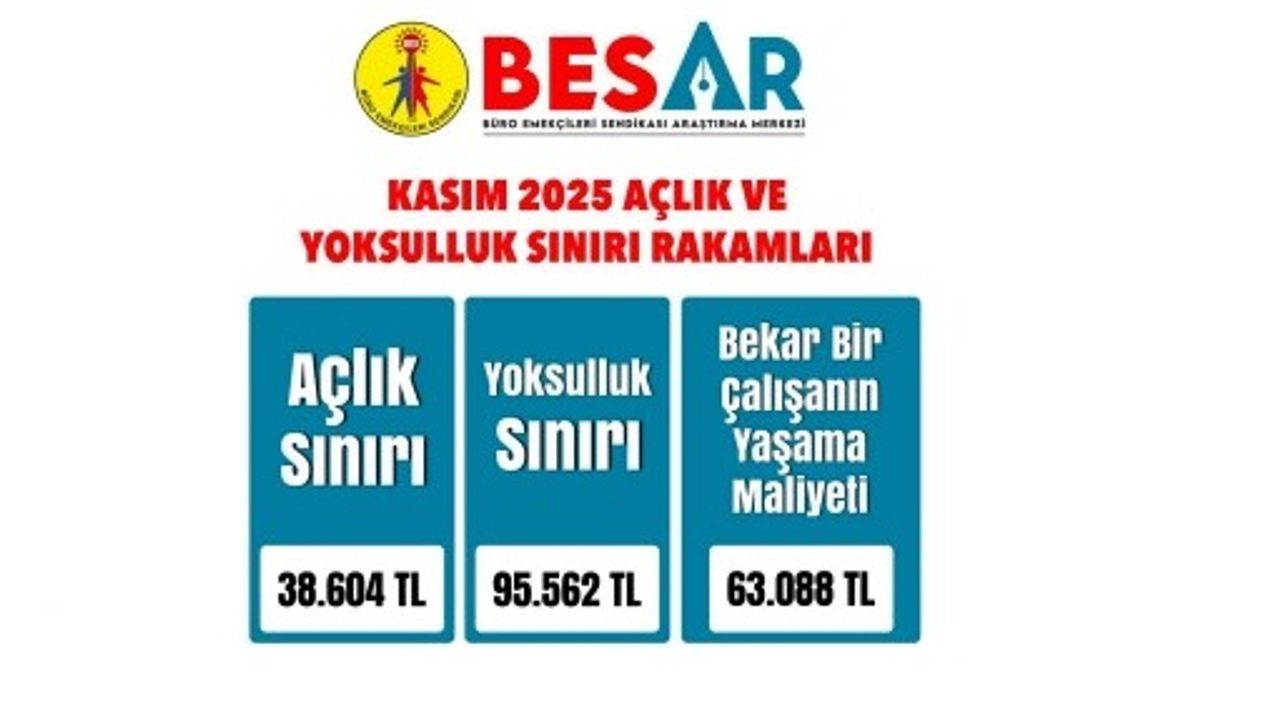 Büro Emekçileri Sendikası Araştırma Merkezi’nin (BES-AR) Kasım 2025 raporuna göre dört kişilik bir memur ailesinin sağlıklı beslenmesi için yapması gereken aylık harcama tutarı 38 bin 604 TL oldu. Tek bir (bekâr) çalışanın yaşam maliyeti 63 bin 088 TL, yoksulluk sınırı ise 95 bin 562 TL olarak hesaplandı.