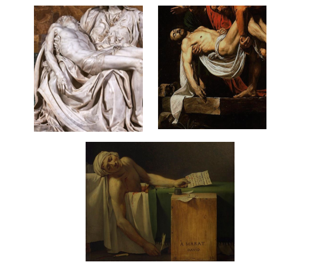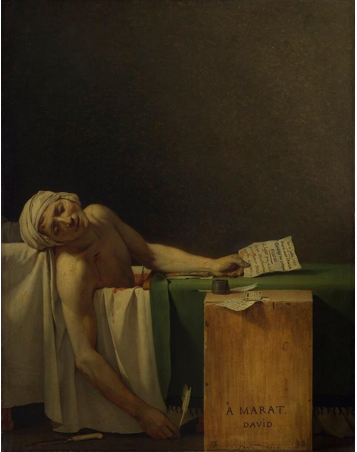 Jacques-Louis David, Marat’nın Ölümü tablosunda cinayet mahallini resmetmiştir. Resme baktığınızda Rönesans döneminin ışık ve renk kompozisyonunun modern bir yorumunu görürsünüz. Marat’ın küvetin kenarından aşağı sarkan kolu; Michelangelo'nun Pieta heykelindeki veya Caravaggio’nun İsa’nın Mezara Konuluşu eserindeki İsa figürünü andırır. Bu benzerlik tesadüf değildir. David, Marat’a adeta dini bir kutsallık atfetmiştir.