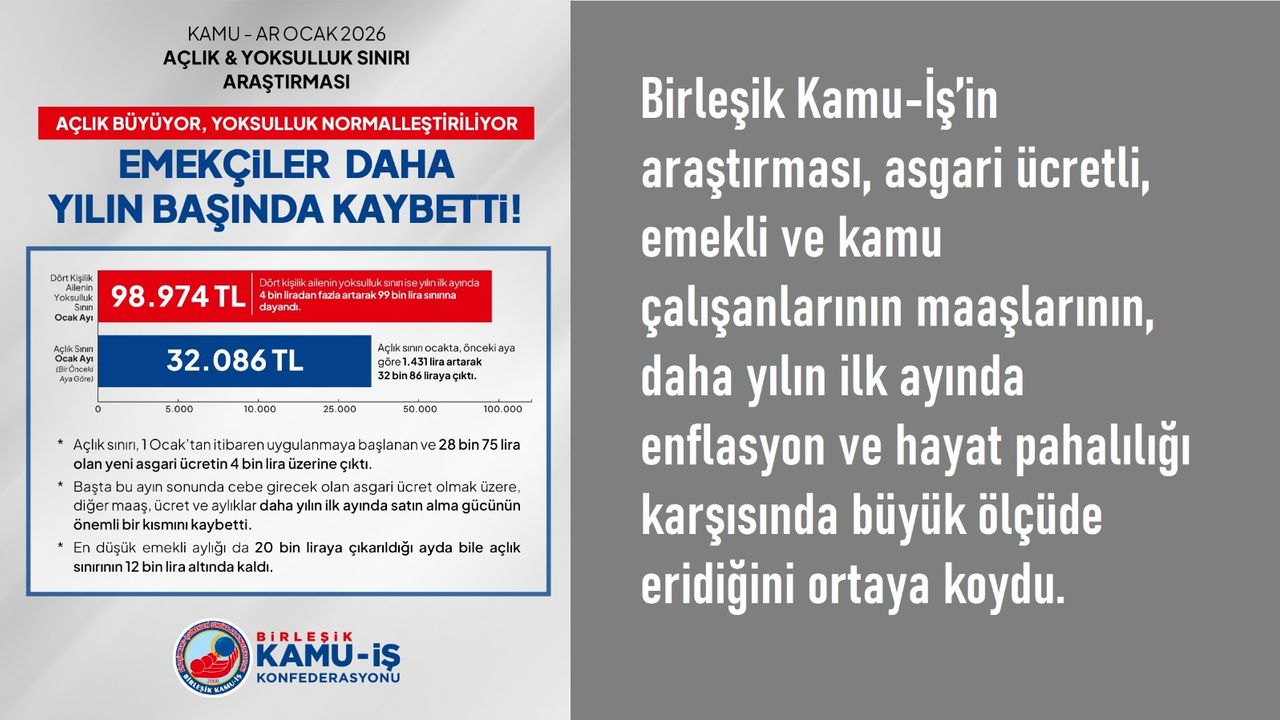 Birleşik Kamu-İş’in araştırması, asgari ücretli, emekli ve kamu çalışanlarının maaşlarının, daha yılın ilk ayında enflasyon ve hayat pahalılığı karşısında büyük ölçüde eridiğini ortaya koydu. Açlık sınırının asgari ücreti aşması, milyonlarca hanenin sağlıklı beslenme hakkına dahi erişemediğini gözler önüne serdi.