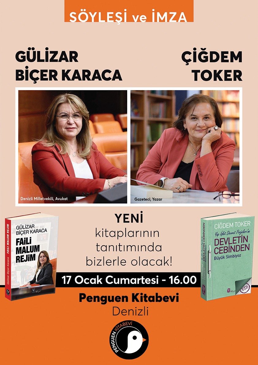 Cumhuriyet Halk Partisi (CHP) Denizli Milletvekili Gülizar Biçer Karaca, Denizli Penguen Kitabevi’nde düzenlenecek söyleşi ve imza gününde okurlarla bir araya geliyor.