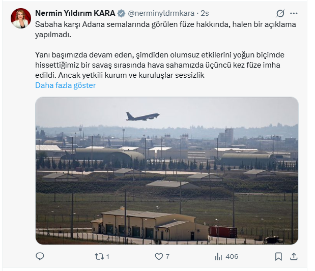 CHP Hatay Milletvekili Nermin Yıldırım Kara, sabaha karşı Adana semalarında görülen ve üçüncü kez imha edilen füze hakkında yetkili kurum ve kuruluşların sessiz kalmasını eleştirdi.