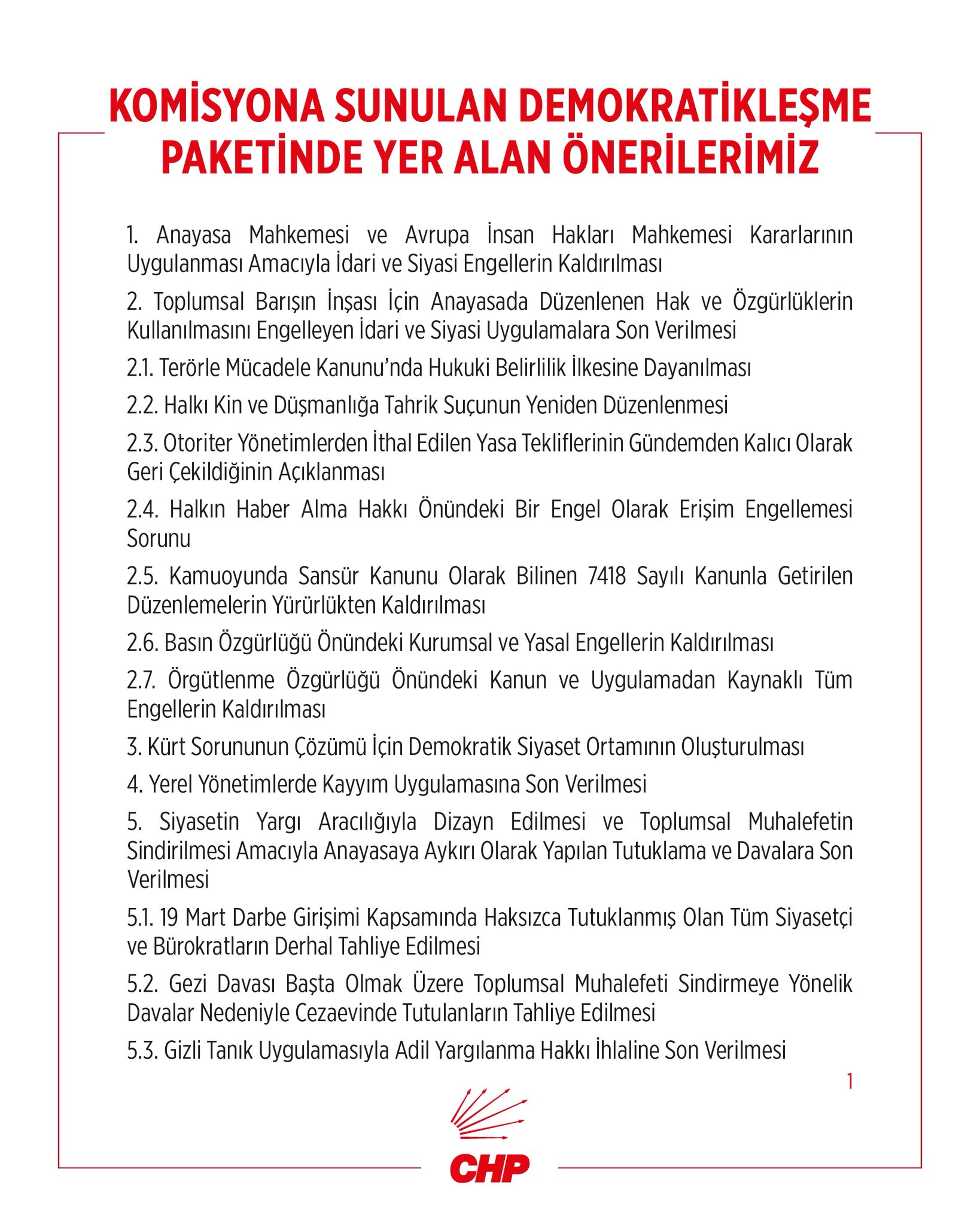 CHP, demokratikleşme, hukukun üstünlüğü ve toplumsal barışın güçlendirilmesi amacıyla hazırladığı kapsamlı Demokratikleşme Paketi’ni TBMM Çözüm Komisyonu’na sundu. Paket; yargı bağımsızlığı, ifade özgürlüğü, insan hakları, Kürt sorununda demokratik çözüm ve kayyım uygulamalarının kaldırılması gibi başlıklar içeriyor.