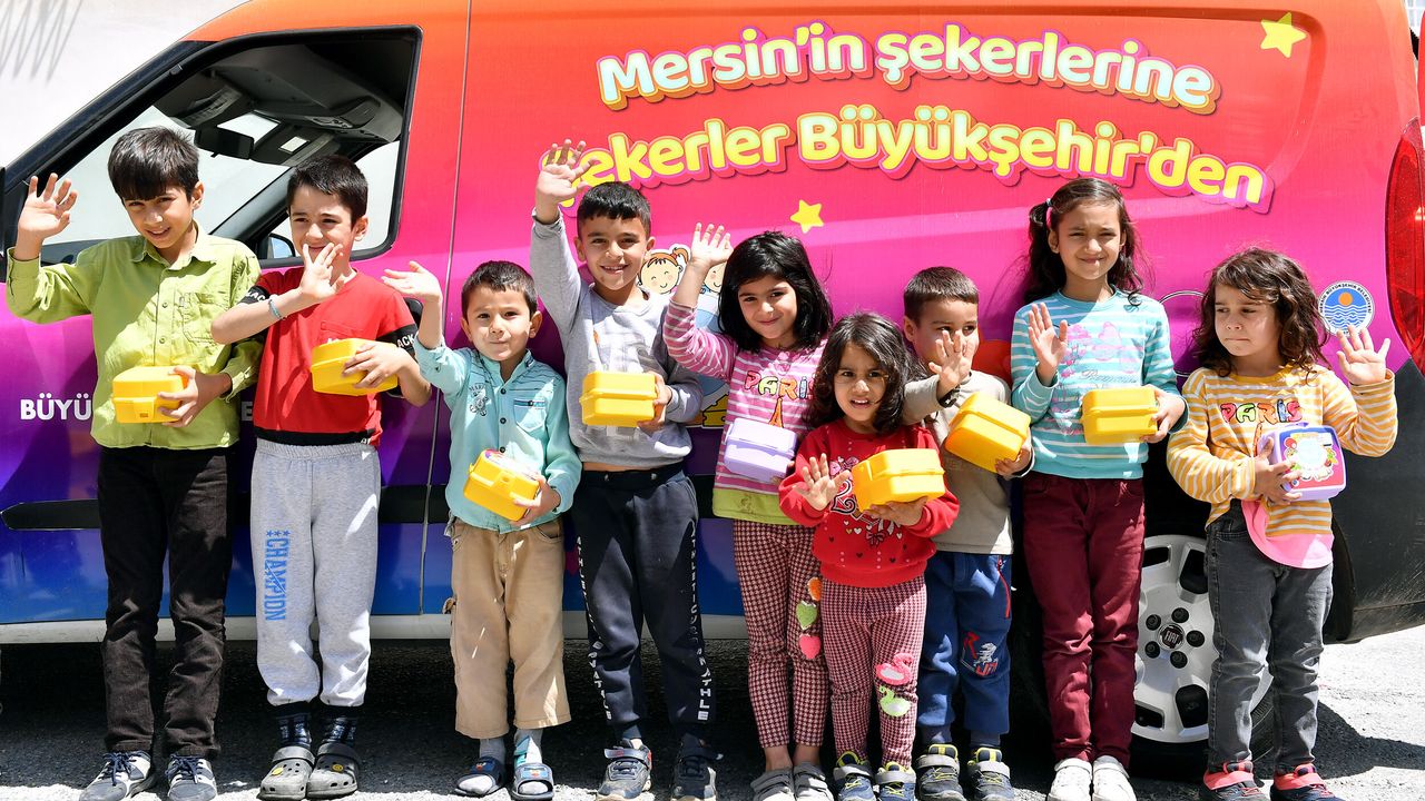 Mersin Büyükşehir Belediyesi ekipleri, Ramazan Bayramı’nda mahalle mahalle dolaşarak çocuklara bayram şekeri ve kuruyemiş dağıttı. Sarı, kırmızı, lacivert ve lila renkli beslenme kutularına yerleştirilen şeker ve kuruyemişler sayesinde çocuklar, Ramazan Bayramı ve 23 Nisan sevincini erkenden yaşadı.