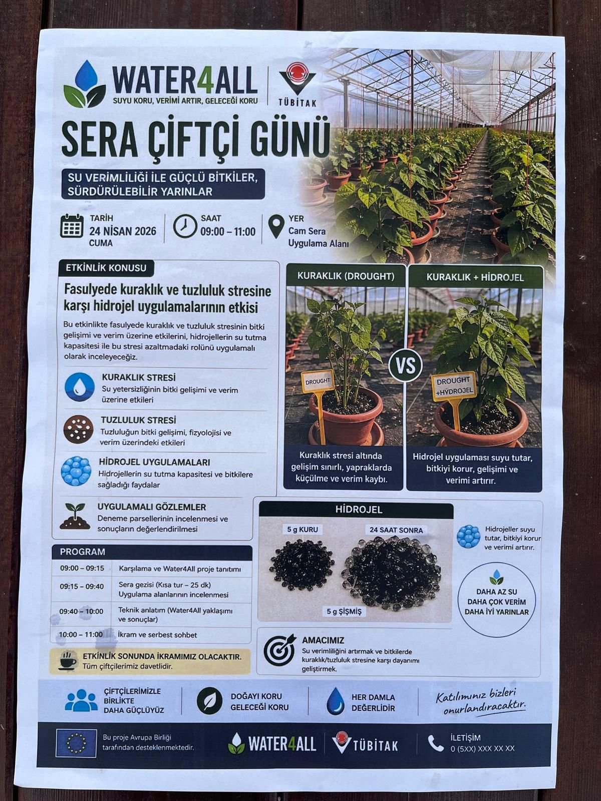 “Suyu Koru, Verimi Artır, Geleceği Koru” mottosuyla gerçekleştirilen etkinlikte, günümüz tarımının en önemli sorunları arasında yer alan kuraklık ve tuzluluk stresi ele alındı. Program boyunca özellikle fasulye üretiminde hidrojel uygulamalarının bitki gelişimi ve verim üzerindeki etkileri uygulamalı olarak incelendi.
