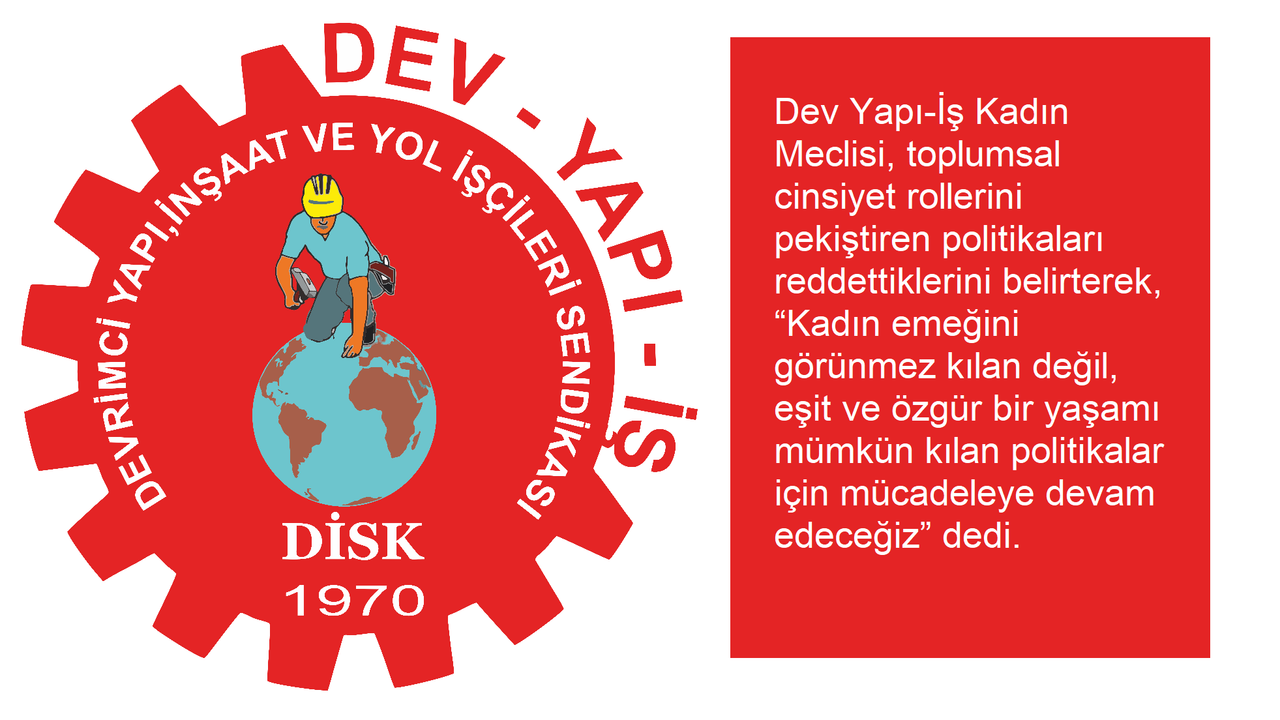 Dev Yapı-İş Kadın Meclisi, toplumsal cinsiyet rollerini pekiştiren politikaları reddettiklerini belirterek, “Kadın emeğini görünmez kılan değil, eşit ve özgür bir yaşamı mümkün kılan politikalar için mücadeleye devam edeceğiz” dedi.