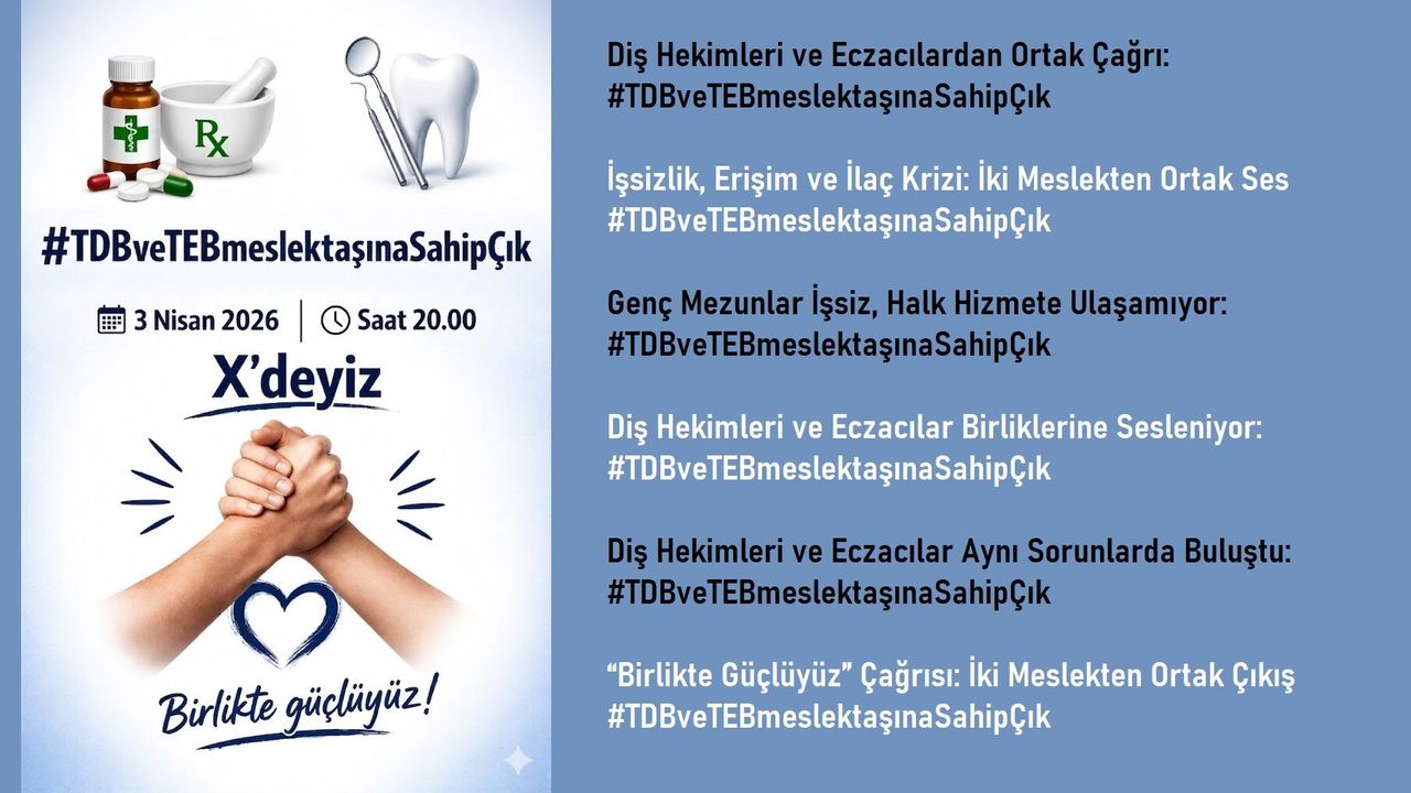 Diş hekimleri ve eczacılar, 3 Nisan akşamı sosyal medyada ortak bir ses oluşturmayı hedefliyor. #TDBveTEBmeslektaşınaSahipÇık vurgusuyla yürütülecek çalışma, meslek örgütlerine yönelik çağrıyı büyütmeyi ve kamuoyunda daha geniş bir farkındalık yaratmayı amaçlıyor.