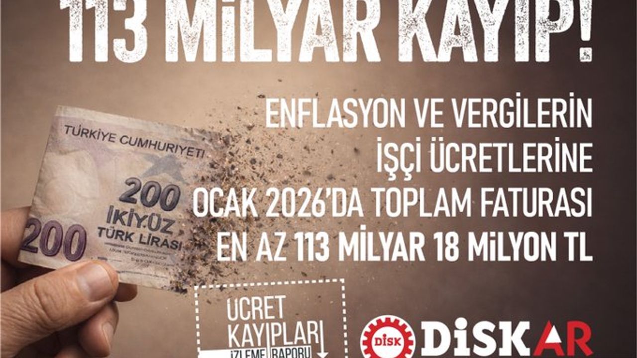 ANKARA – DİSK Araştırma Merkezi (DİSK-AR) tarafından hazırlanan Ücret Kayıpları İzleme Raporu (Şubat 2026) yayımlandı. Rapora göre, yüksek enflasyon ve adaletsiz vergi yükü nedeniyle Ocak 2026’da işçi ücretlerinde yaşanan toplam kayıp en az 113 milyar 18 milyon TL oldu.