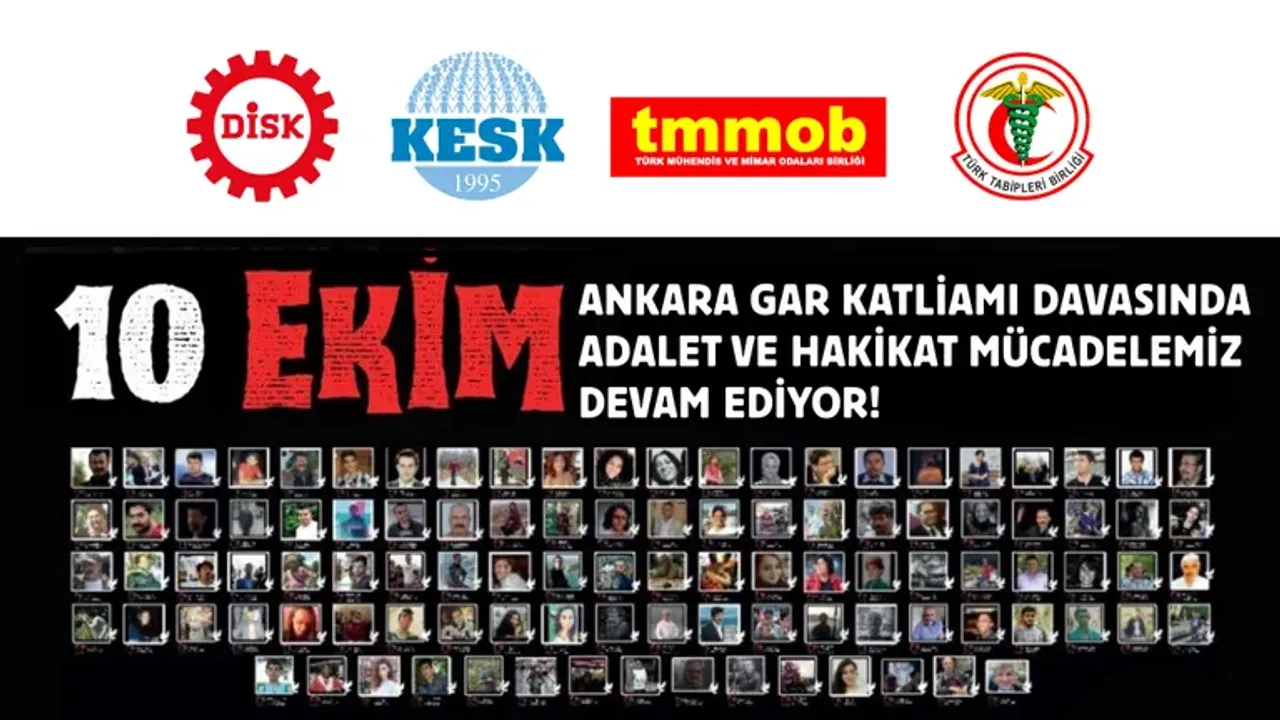DİSK, KESK, TMMOB ve TTB’nin ortak yazılı açıklamasında, çağrıcısı oldukları ve on binlerce kişinin katıldığı “Emek, Barış ve Demokrasi” mitingine yönelik saldırının Cumhuriyet tarihinin en büyük katliamı olduğu hatırlatıldı. Saldırıda 103 kişinin yaşamını yitirdiği, çok sayıda kişinin yaralandığı ve toplumda onarılması mümkün olmayan derin yaralar açıldığı belirtildi. Açıklamada, acıların dinmemesinin temel nedenlerinden birinin de yargı sürecinde yaşananlar olduğu vurgulandı.