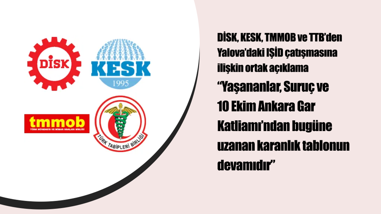DİSK, KESK, TMMOB ve TTB, 8 Aralık’ta Yalova’da IŞİD hücre evine yönelik operasyon sırasında yaşanan çatışmada üç güvenlik görevlisinin hayatını kaybetmesine ilişkin ortak basın açıklaması yaptı.