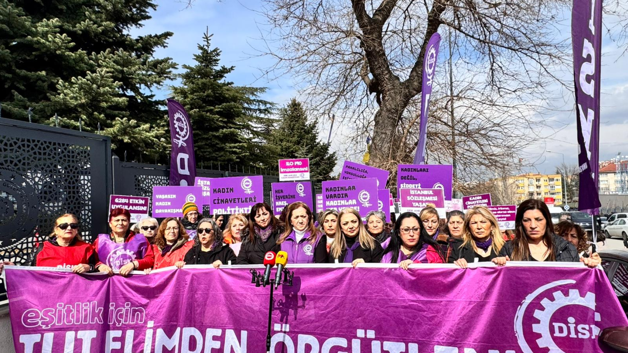 DİSK’li kadınlar 8 Mart 2026 dolayısıyla Çalışma ve Sosyal Güvenlik Bakanlığı önünde bir araya geldi. DİSK İç Anadolu Bölge Temsilcisi Birgül Kaya’nın okuduğu ortak açıklamanın ardından konuşan DİSK Genel Başkanı Arzu Çerkezoğlu, kadınlara dayatılan esnek çalışma modellerine tepki göstererek, “Kadınların üzerindeki bakım yükü kamusal politikalarla kaldırılmalı, işyerlerinde şiddet ve tacize karşı ILO’nun 190 sayılı sözleşmesi derhal onaylanmalıdır” dedi.