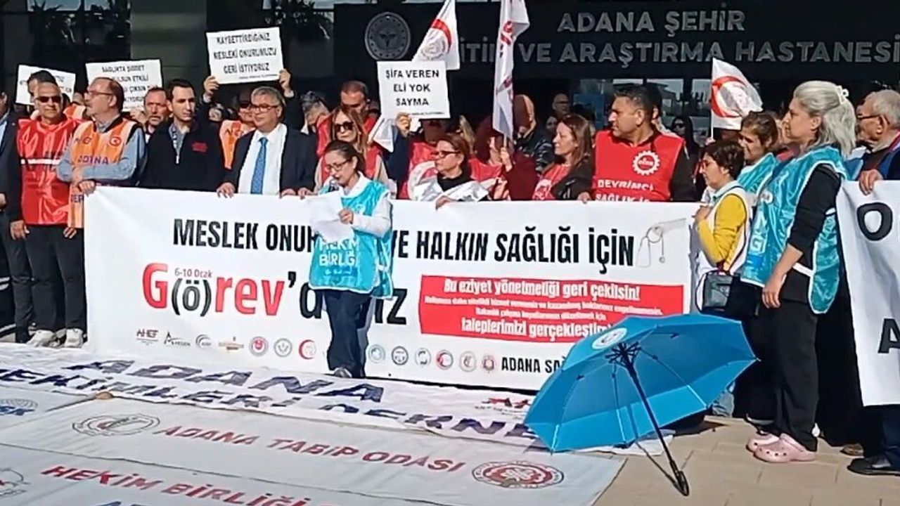 Adana’da sağlık emekçilerinin 6-10 Ocak 2025 tarihleri arasında başlattığı iş bırakma eyleminin üçüncü gününde, Adana Şehir Hastanesi önünde bir basın açıklaması düzenlendi. Hekim Birliği Adana Şube Başkanı Dr. Mehtap Şahin, açıklamasında şu ifadelere yer verdi: