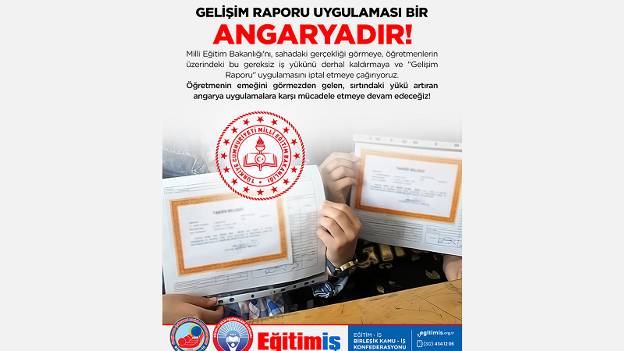 Eğitim-İş, Milli Eğitim Bakanlığı’na çağrıda bulunarak, sahadaki gerçekliğin görülmesini, öğretmenlerin üzerindeki gereksiz iş yükünün kaldırılmasını ve “Gelişim Raporu” uygulamasının lise kademesinde iptal edilmesini talep etti.