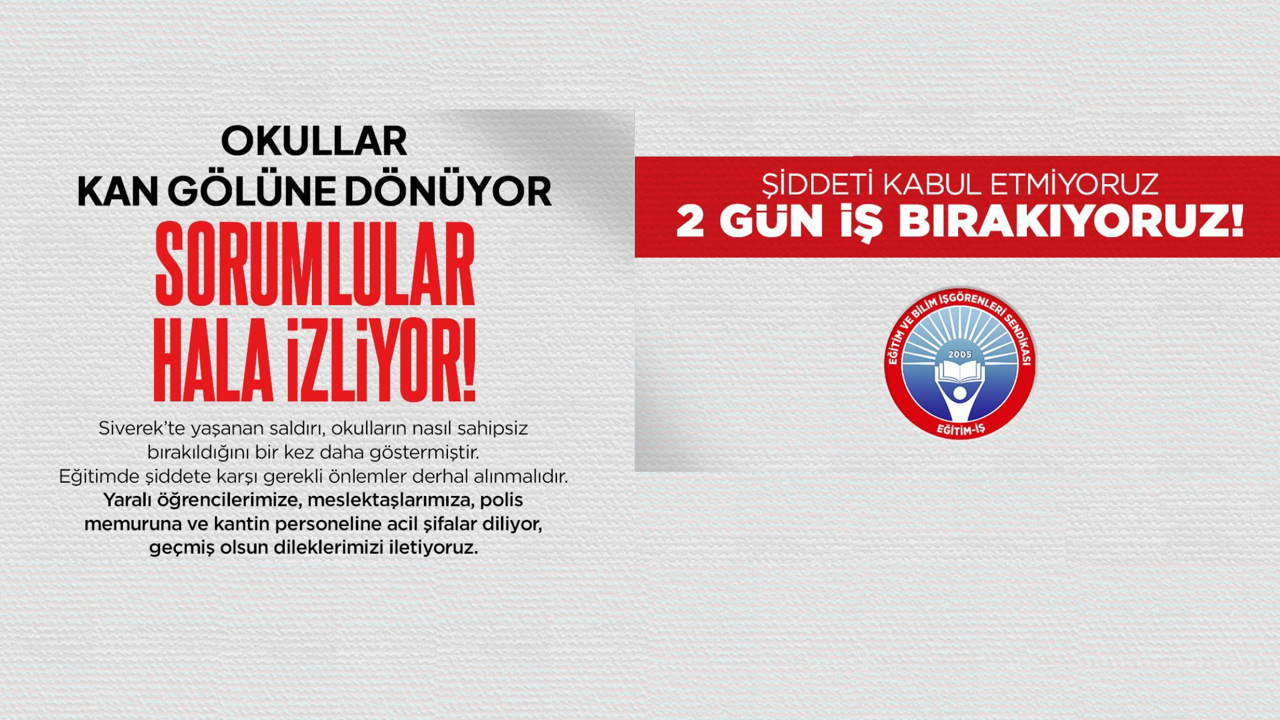 Eğitim-İş, Şanlıurfa’nın Siverek ilçesinde bir lisede yaşanan silahlı saldırının ardından sert bir açıklama yaparak iki gün iş bırakma kararı aldığını duyurdu. Sendika, okullarda artan şiddetin artık görmezden gelinemeyecek boyutlara ulaştığını vurgulayarak, acil önlem alınmaması halinde daha ağır sonuçların yaşanacağı uyarısında bulundu.