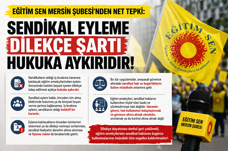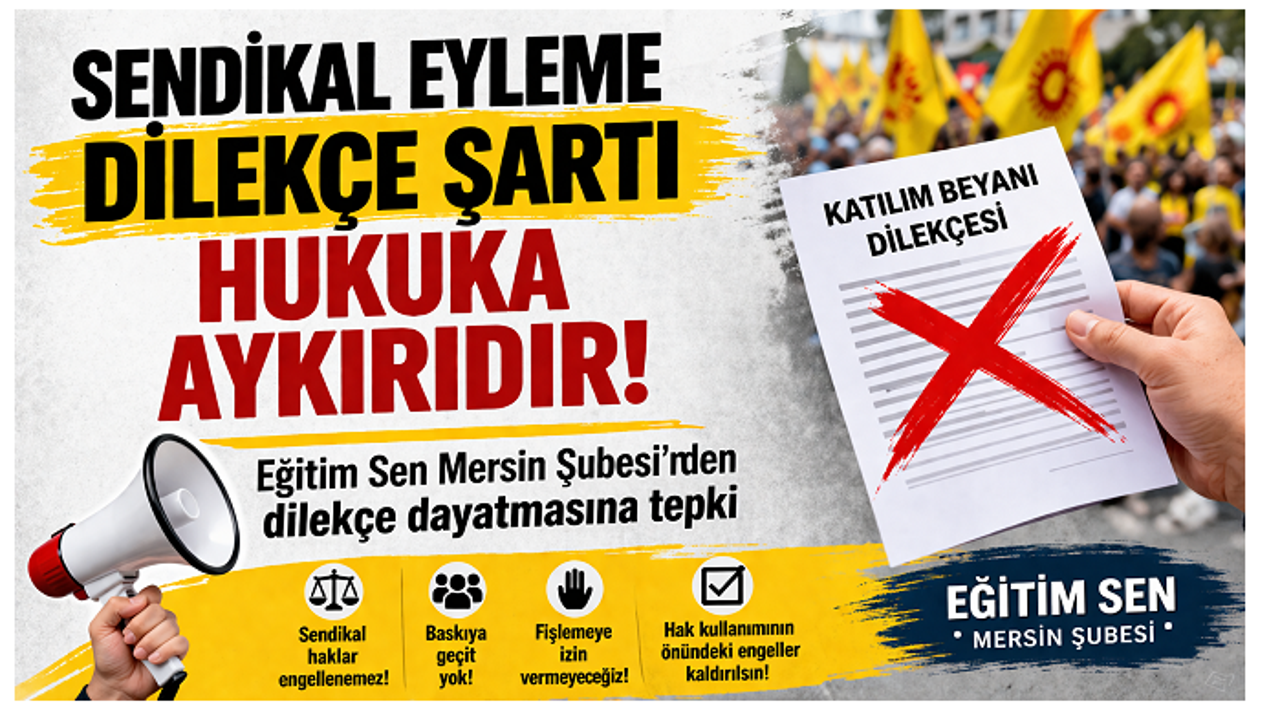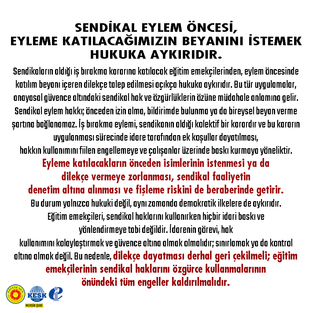 Eğitim Sen Mersin Şubesi, sendikaların aldığı iş bırakma kararına katılacak eğitim emekçilerinden eylem öncesinde “katılım beyanı içeren dilekçe” istenmesinin hukuka aykırı olduğunu belirterek uygulamaya sert tepki gösterdi.
