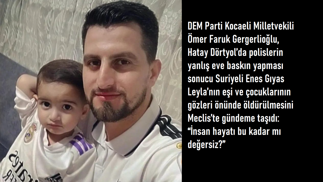 DEM Parti Kocaeli Milletvekili Ömer Faruk Gergerlioğlu, Hatay Dörtyol’da yanlış adrese yapılan polis baskınında Suriyeli Enes Gıyas Leyla’nın eşi ve çocuklarının önünde vurularak yaşamını yitirmesini Meclis’te gündeme taşıdı.