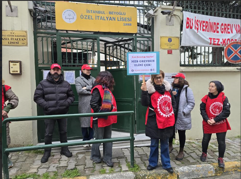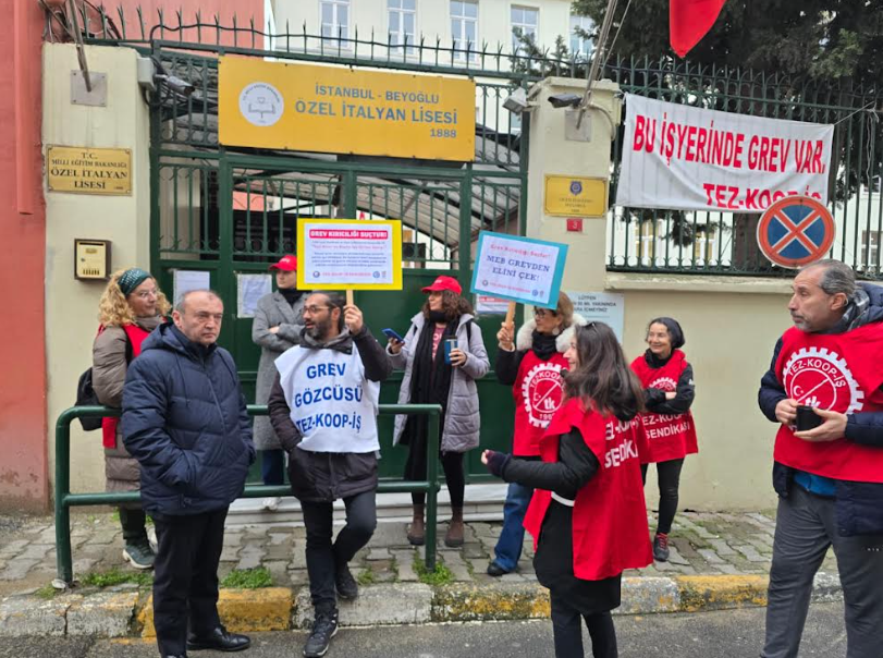 Özel İtalyan Lisesi’nde grevde olan öğretmenler bugün grev kırıcı olarak MEB tarafından okula atanan ikame öğretmenlerin önüne barikat kurdu. Sabahın erken saatleri itibari ile okul önünde buluşan grev yapan öğretmenler, Tez-Koop-İş Sendikası İstanbul 5 No.lu Şube yöneticileri ile birlikte Özel İtalyan Lisesi’nin giriş kapıları önünde kol kola girerek insan zinciri oluşturdular.