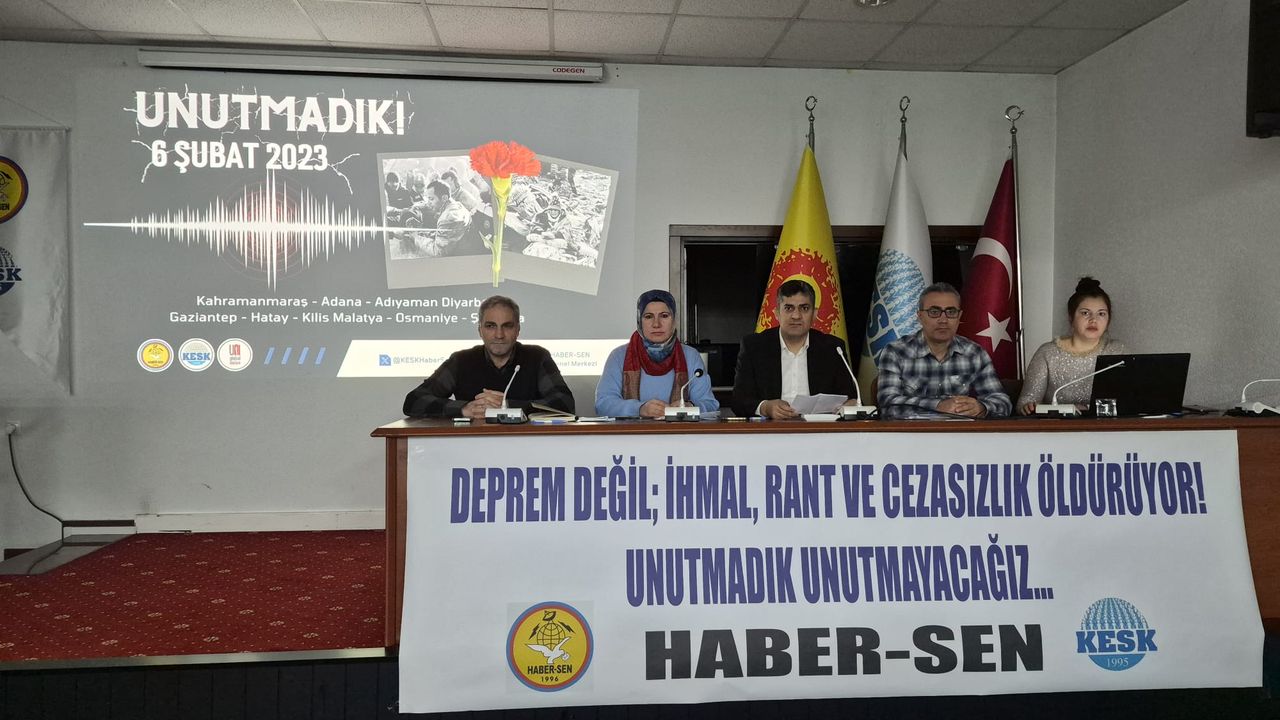 HABER-SEN Genel Merkezi ve şube yöneticileri, 6 Şubat depremlerinin üçüncü yıl dönümünde yaptıkları basın açıklamasında, yaşanan yıkımın doğal bir afetten çok siyasal tercihlerin sonucu olduğunu vurguladı. Açıklamayı HABER-SEN Genel Başkanı Mesut Balcan okudu.