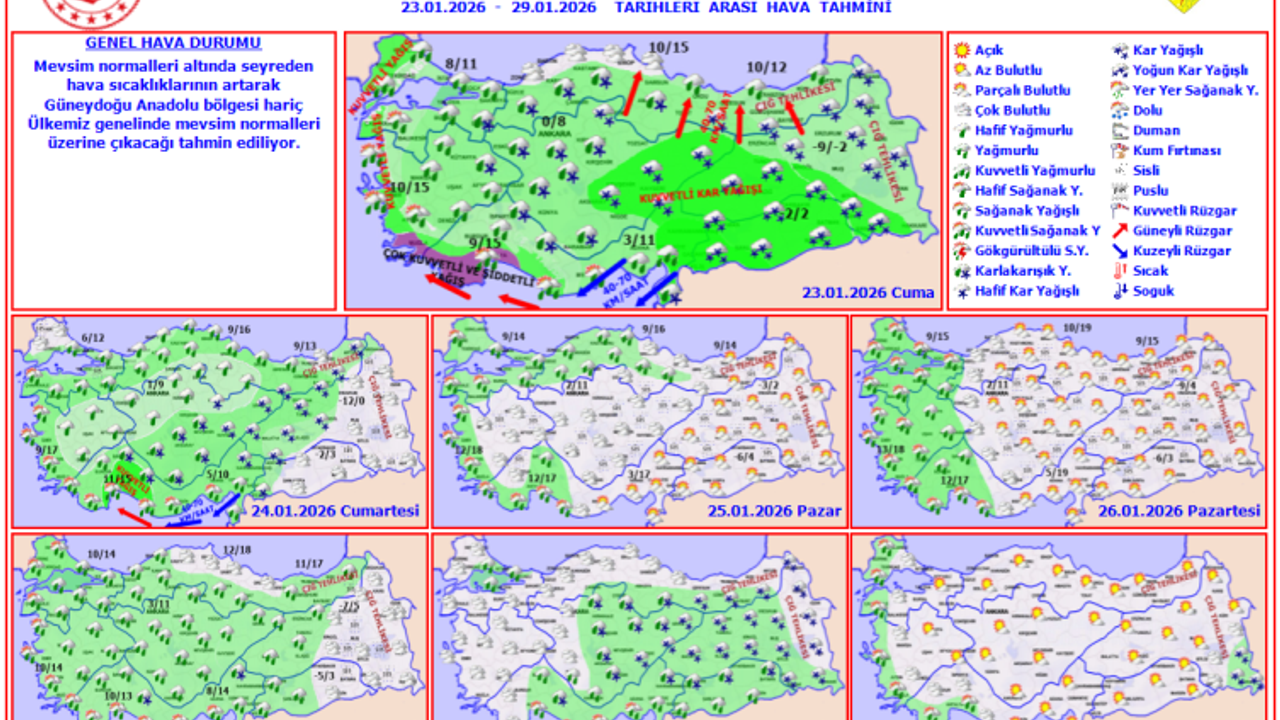 MGM tahminlerine göre hava sıcaklıkları güney kesimlerde mevsim normallerinin 1 ila 3 derece, diğer bölgelerde ise yer yer 3 ila 6 derece üzerinde seyredecek. Hafta başında etkili olan dondurucu soğukların yerini, daha ılıman ancak yağışlı bir hava alacak.