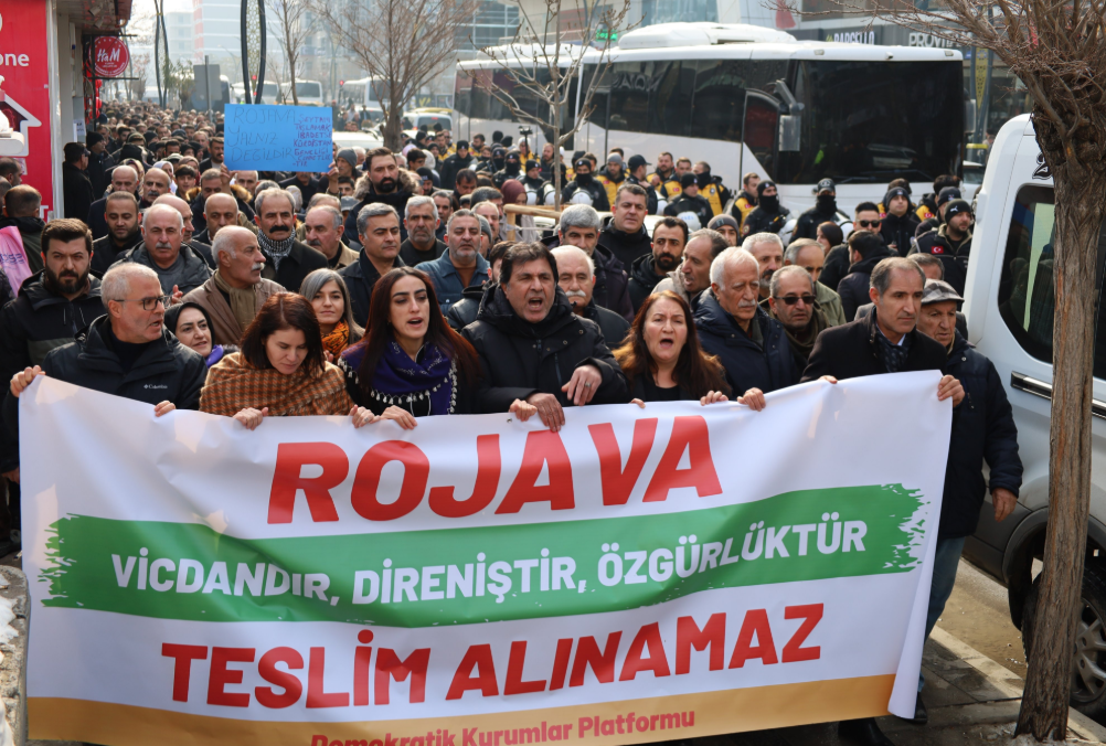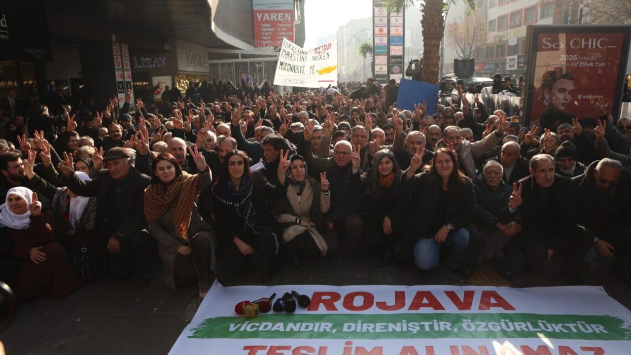 Van’da bir araya gelen yurttaşlar, Halep’in Şêxmeqsûd ve Eşrefiyê mahallelerinde yaşanan saldırılara tepki gösterdi. Yürüyüş, DBP Van İl Örgütü binası önünden başlayarak Sanat Sokağı’nda sona erdi.