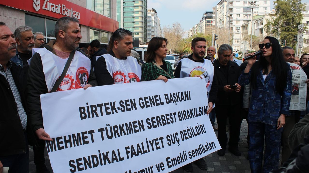 Adana’da BİRTEK-SEN Genel Başkanı Mehmet Türkmen’in tutukluluğu sendikal camiada sert tepkilere yol açtı. Eğitim-İş Adana 1 No’lu Şube Başkanı ve Birleşik Kamu-İş Adana İl Başkanı Hatice Hazar, düzenlenen basın açıklamasında sendikal faaliyetlerin suç gibi gösterilmesine karşı çıktı.