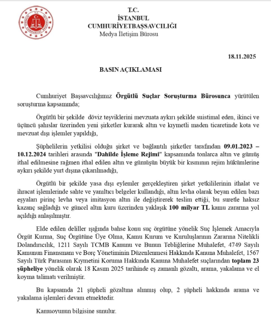 İstanbul Cumhuriyet Başsavcılığı, örgütlü suç kapsamında yürütülen geniş çaplı soruşturmada, tonlarca altın ve gümüş üzerinden usulsüz işlemler yapılarak yaklaşık 100 milyar TL kamu zararı oluştuğunu açıkladı. Soruşturmaya konu olan faaliyetlerde, döviz teşvikleri ile ithalat rejiminin kötüye kullanıldığı ve altın ticaretinde büyük ölçekli bir vurgun gerçekleştirildiği bildirildi.