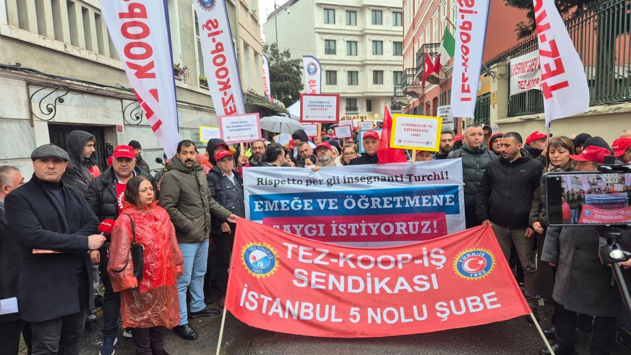 Tez-Koop-İş Sendikası İstanbul 5 No.lu Şubesi’nde örgütlü Özel İtalyan Lisesi öğretmenlerinin grevi 17. gününe girerken, eylem adresi İtalyan Konsolosluğu önü oldu. 18 Şubat 2026 Çarşamba günü saat 11.30’da yapılan basın açıklamasında öğretmenler, kışın soğuğunda günlerdir sürdürdükleri direnişin bir “rakam pazarlığı” değil, yılların biriktirdiği adaletsizliklere karşı bir onur mücadelesi olduğunu vurguladı.