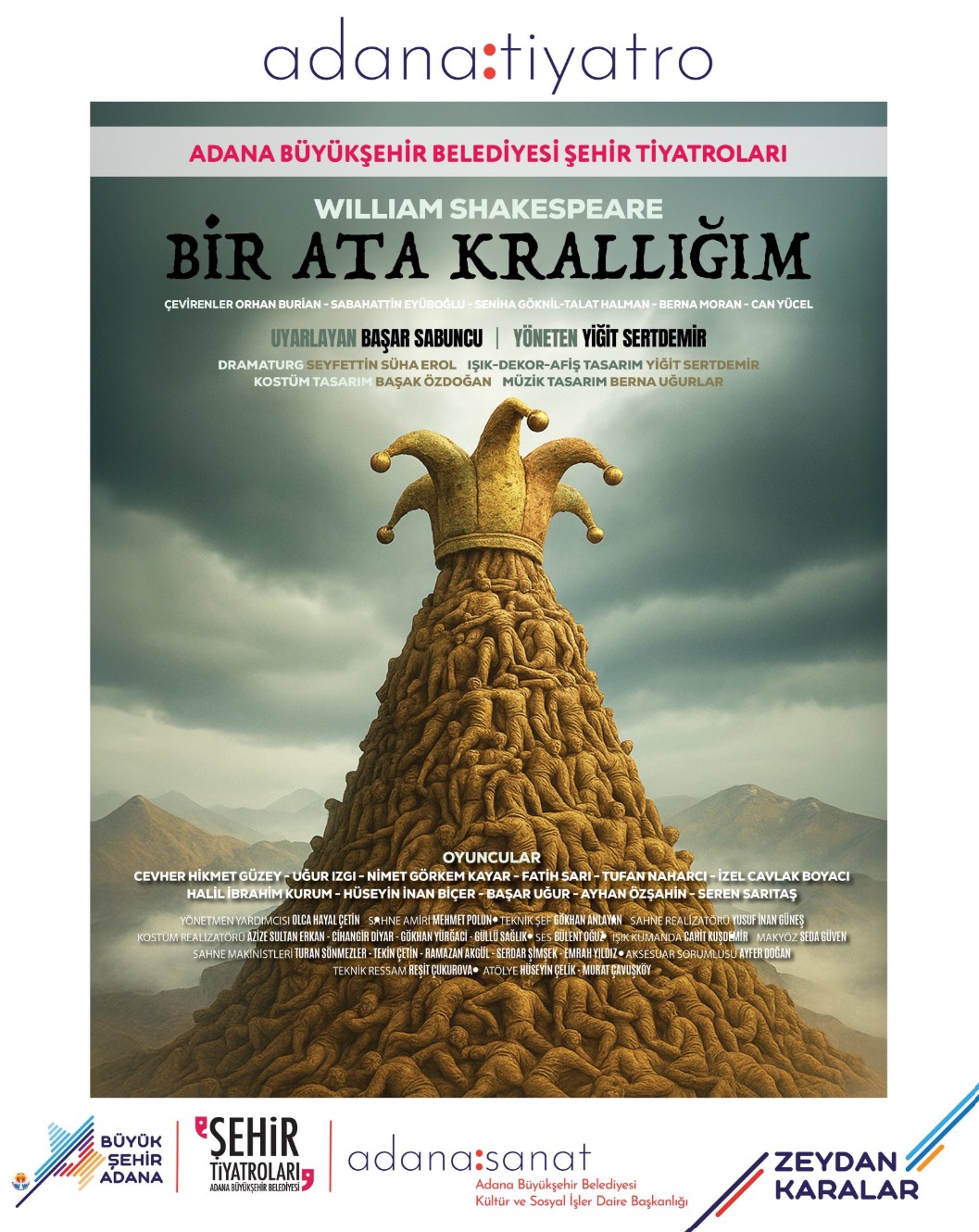 Bir Ata Krallığım oyunu, Adana Büyükşehir Belediyesi Şehir Tiyatroları’nın yeni sezonunda Yiğit Sertdemir rejisiyle sahneye konuluyor. Oyunun başlamasıyla beraber seyirci kendisini metnin karanlık atmosferinin içerisinde buluyor. Işık ve dekor tasarımı son zamanlarda Adana’da sergilenen tiyatro oyunlarında nadir görülen tasarımlardan. Ölü beden figürlerinin üstünde yükselen krallık dekoru, oyunun metnini vurucu şekilde betimliyor. İktidar hırsı, yaşam-ölüm çelişkisi ve toplumsal çöküş gibi temalar, sahne estetiğine taşınırken cansız bedenler kullanılmasa olmazdı. Bu karanlık atmosferin karanlığını kaybetmeden, sinematik ışık tasarımı ile görünür kılmak da ayrıca bir alkışı hak ediyor.