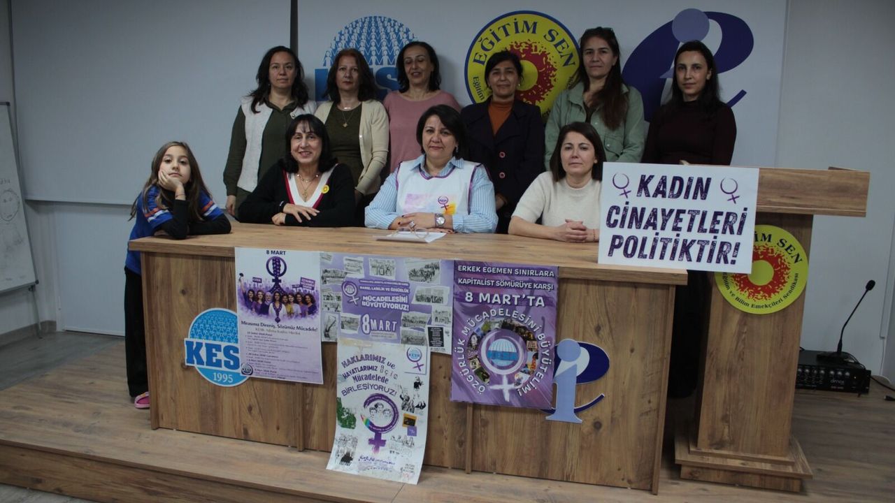 KESK Adana Kadın Meclisi, Eğitim Sen Adana Şubesi’nde yaptığı basın açıklamasıyla 8 Mart mitingine katılım çağrısı yaptı. Açıklamayı okuyan Özgür Kiracı, kadınların yoksulluğa, şiddete, güvencesizliğe ve savaşa karşı barış, laiklik ve özgürlük mücadelesini büyütmek için alanlarda olacaklarını söyledi.