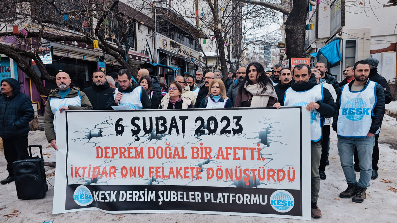 KESK Dersim Şubeler Platformu, 6 Şubat depremlerinin üçüncü yılında Sanat Sokağı’nda yaptığı açıklamada, yaşanan büyük yıkımın doğal bir felaketle açıklanamayacağını vurguladı. Açıklamayı okuyan Eğitim Sen Dersim Şube Sekreteri İlhan Öner, rant ve imar politikalarının on binlerce can kaybının önünü açtığını belirtti.