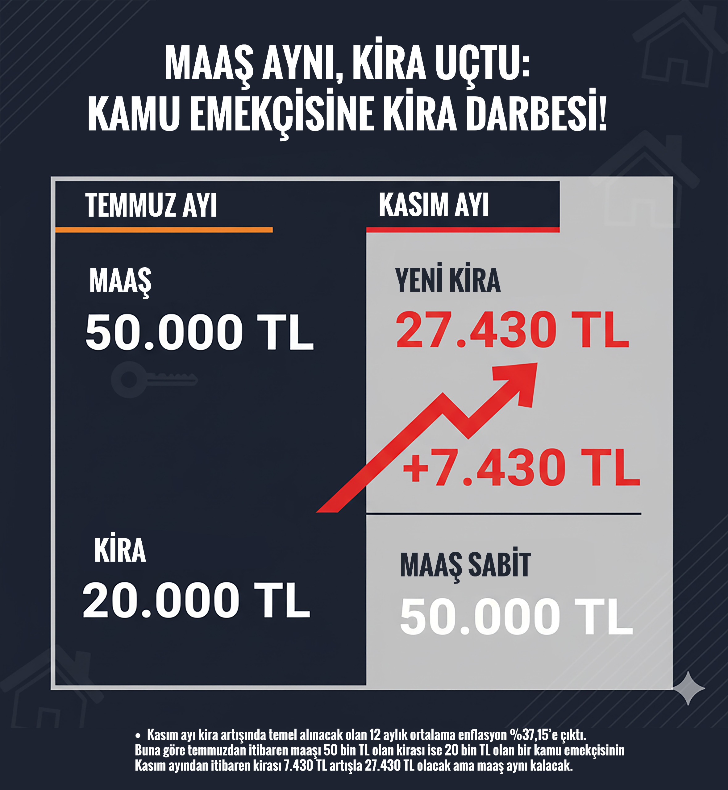 Kasım ayında uygulanacak kira artış oranı, 12 aylık ortalama enflasyon olan %37,15’e göre belirlenecek. Bu artış, maaşı 50 bin TL olan ve 20 bin TL kira ödeyen bir kamu emekçisinin kirasının 7.430 TL artarak 27.430 TL’ye çıkması anlamına geliyor. Ancak maaşta herhangi bir artış olmayacak.