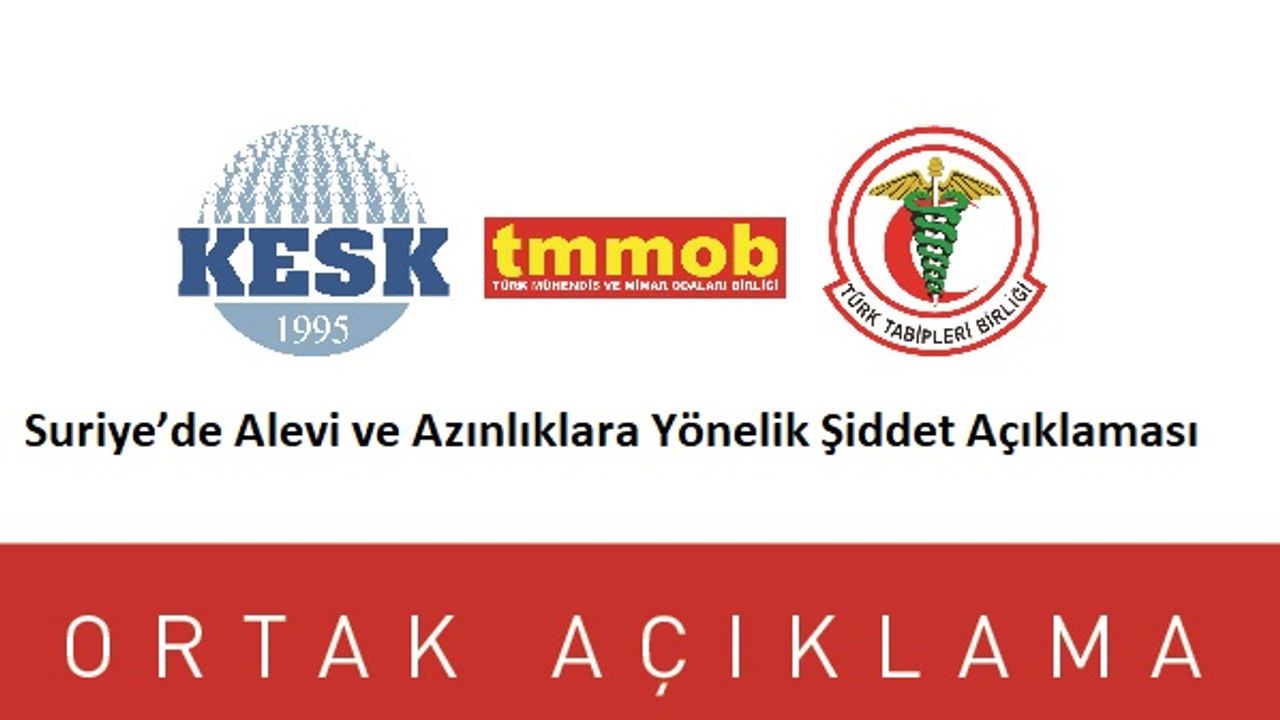 KESK, TMMOB ve Türk Tabipleri Birliği (TTB), Suriye’de HTŞ rejiminin Alevi ve diğer azınlıklara yönelik sistematik katliam, zorla göç ettirme ve hak ihlallerini kınadı. Kurumlar, 2025 başından itibaren özellikle Lazkiye ve Tartus bölgelerinde çoğu kadın ve çocuk binlerce sivilin yaşamını yitirdiği saldırıların arttığını belirtti.