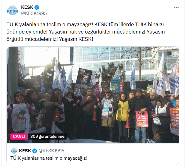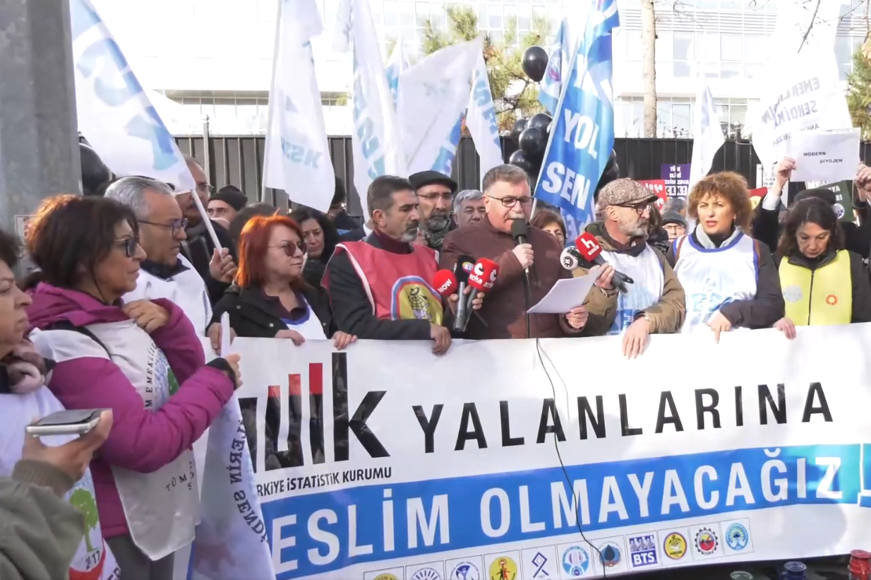 KESK, TÜİK’in açıkladığı enflasyon verilerine tepki göstermek amacıyla TÜİK binası önünde basın açıklaması yaptı. KESK Eş Genel Başkanı Ahmet Karagöz, açıklanan verilerin gerçek hayat pahalılığını yansıtmadığını belirterek, kamu emekçilerinin ve emeklilerin sistematik biçimde yoksullaştırıldığını söyledi. KESK, insanca bir yaşam için 14 Ocak’ta ülke genelinde iş bırakma kararı aldığını duyurdu.