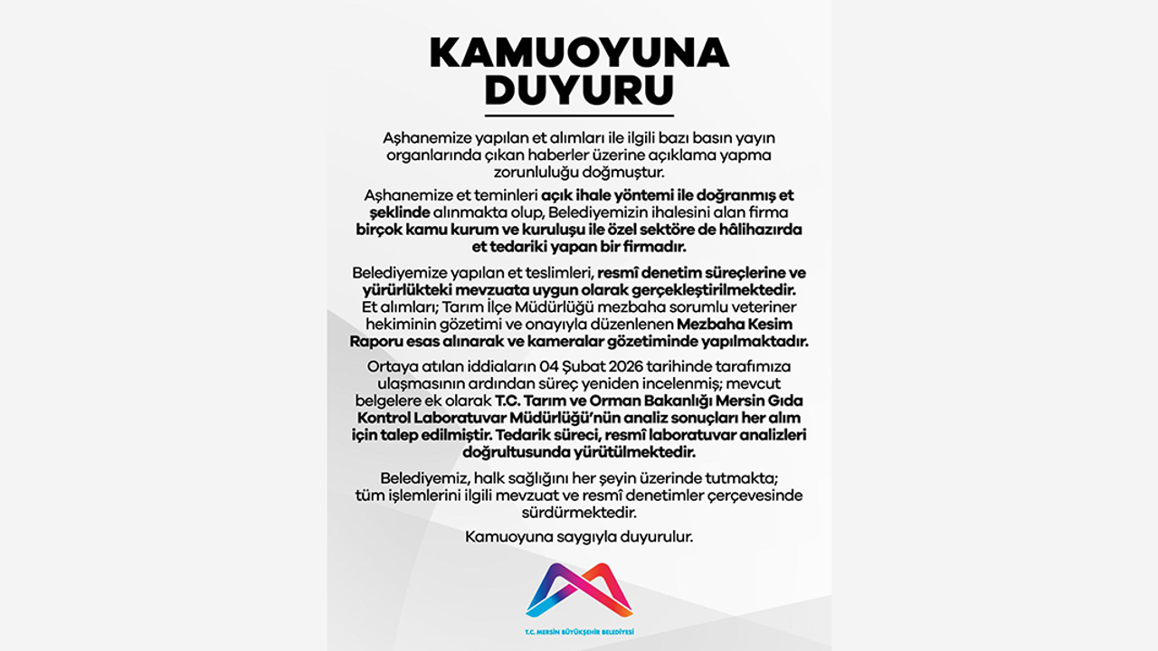 Mersin Büyükşehir Belediyesi, aşhaneye yapılan et alımlarıyla ilgili bazı basın yayın organlarında yer alan haberler üzerine kamuoyuna açıklama yaptı. Belediyeden yapılan duyuruda, iddialar nedeniyle sürecin yeniden incelendiği ve tüm alımların mevzuata uygun şekilde gerçekleştirildiği belirtildi.
