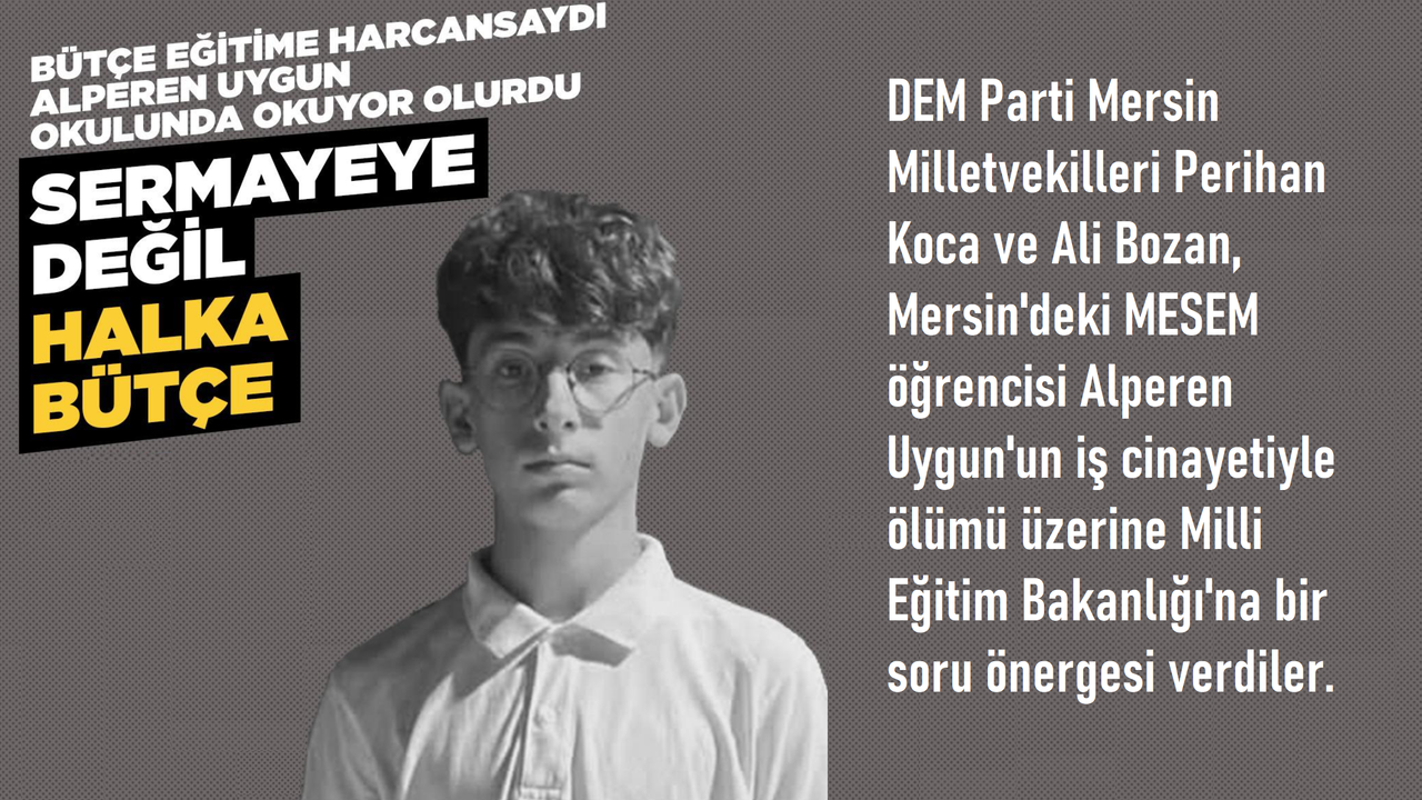DEM Parti Mersin Milletvekilleri Perihan Koca ve Ali Bozan, MESEM uygulamaları kapsamındaki çocuk işçi ölümlerinin artmasına dikkat çekerek, çalıştığı işyerinde yaşamını yitiren 15 yaşındaki Alperen Uygun’un ölümünü Milli Eğitim Bakanı Yusuf Tekin’e sordu.
