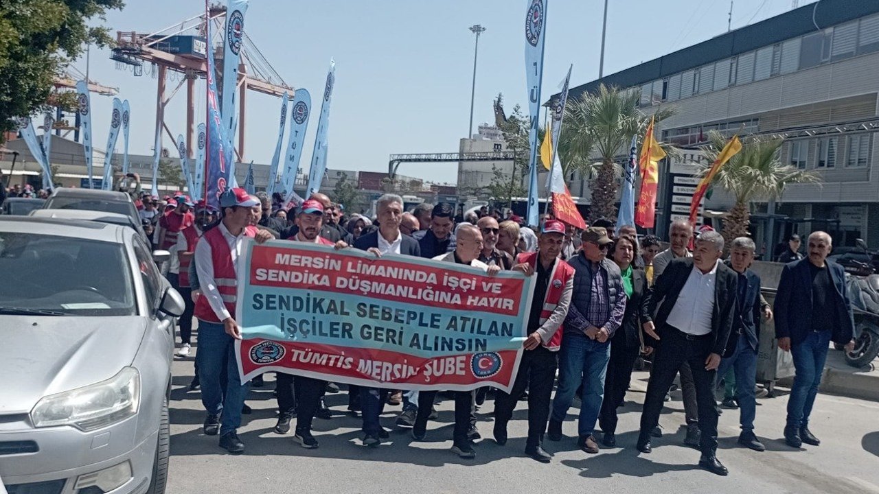 Mersin Uluslararası Liman İşletmeciliği’ne (MIP) bağlı Özgüneş Taşımacılık’ta çalışan ve TÜMTİS’te örgütlendikleri için işten çıkarıldıklarını ifade eden 180’in üzerindeki liman işçisi, 103 gündür süren direnişlerini kararlılıkla sürdürüyor. MIP binası önünde gerçekleştirilen basın açıklaması ve yürüyüşe sendika temsilcileri, siyasi parti üyeleri, demokratik kitle örgütleri ve işçilerin aileleri katıldı. Çocuklarıyla birlikte yürüyen işçiler, sloganlarla hem taleplerini hem de tepkilerini dile getirdi.